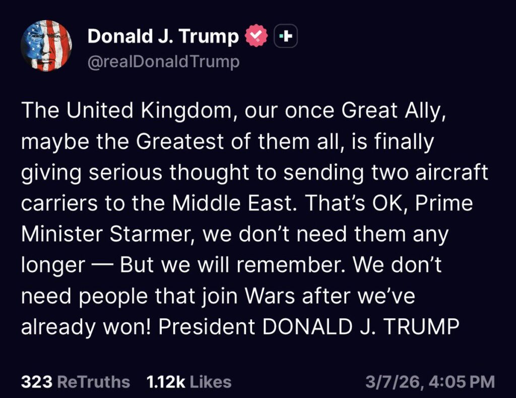 في منشور نشره ترامب على منصة “تروث سوشيال” صباح اليوم، قال الرئيس الأمريكي: “المملكة المتحدة، حليفتنا العظيمة سابقاً، ربما أعظم الحلفاء، تفكر أخيراً في إرسال حاملتي طائرات إلى الشرق الأوسط. حسناً يا رئيس الوزراء ستارمر، لسنا بحاجة إليهم بعد الآن – لكننا سنتذكر. لا نحتاج أشخاصاً ينضمون إلى الحروب بعد أن نكون قد فزنا بالفعل!”. هذا التصريح يحمل سخرية واضحة من التأخر البريطاني المزعوم، ويلمح إلى أن الولايات المتحدة قد حسمت الصراع مع إيران منفردة